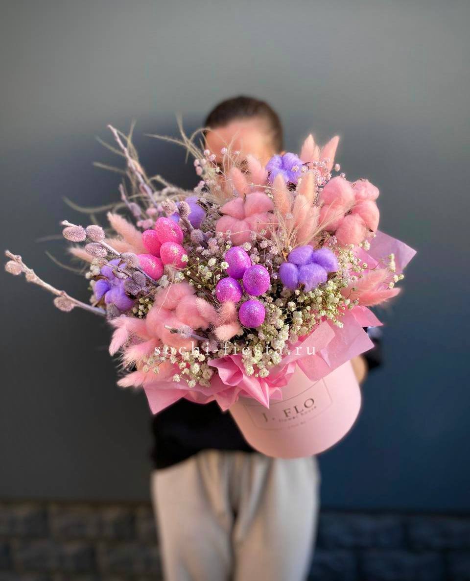 гипсофила, хлопок, верба, ковыль, яйца, лагурус,  тишью, цилиндр D16.