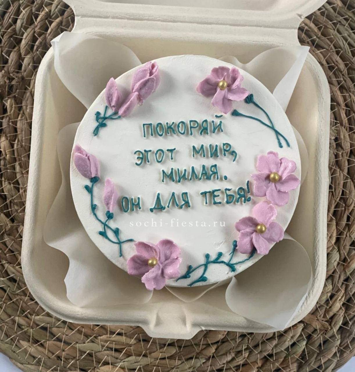 Компактный бенто-торт ручной работы с вдохновляющей надписью и продуманным декором. Начинка клубничный пломбир или шоколадный трюфель раскрывает вкус в каждом кусочке. Упаковка входит в состав.